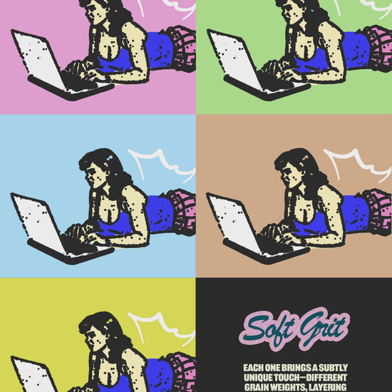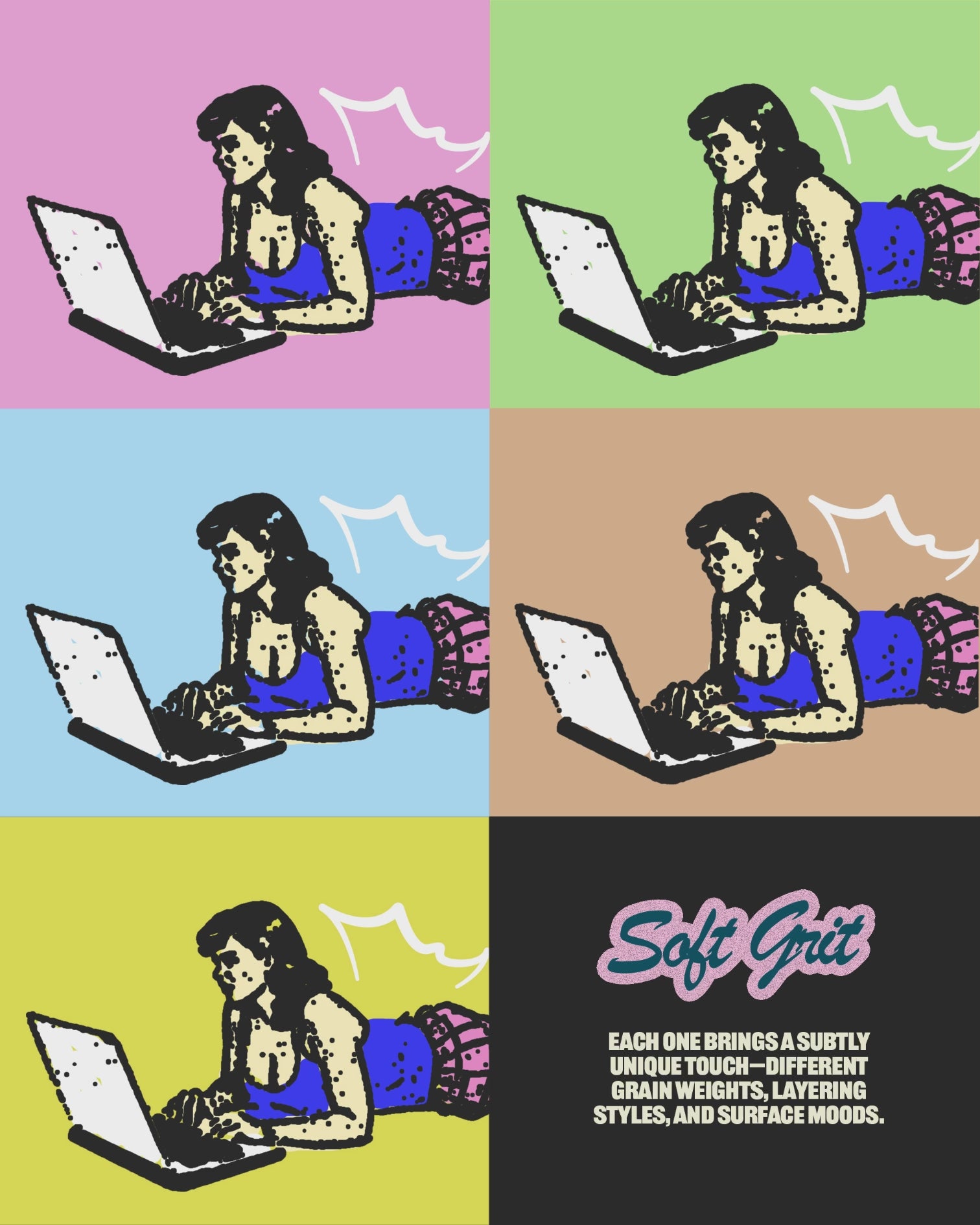 Soft Grit is a curated texture pack made to give your work that natural retro charm—without the grunge overload or filter feel. Just the right amount of grain, glow, scratches. to make your design feel printed, scanned, and worn in a good way. It's all about adding that light roughness that the human eye seems to love even in the age of longer screen times.